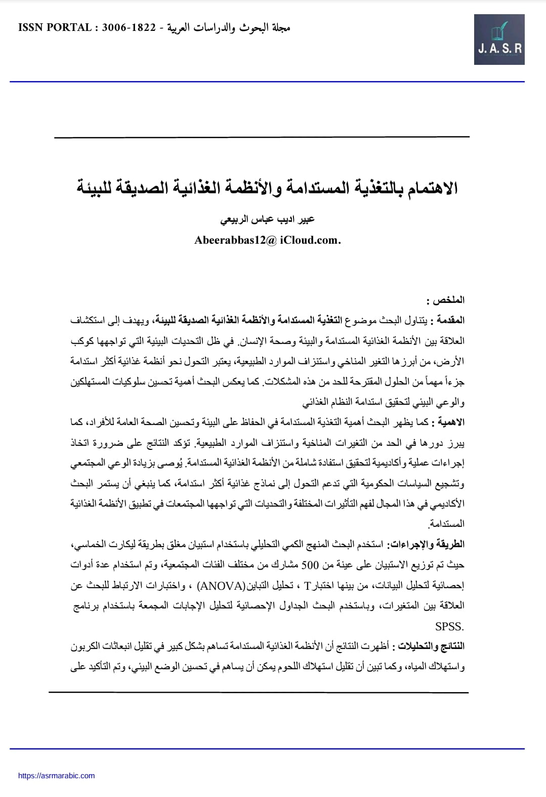المقدمة : يتناول البحث موضوع التغذية المستدامة والأنظمة الغذائية الصديقة للبيئة، ويهدف إلى استكشاف العلاقة بين الأنظمة الغذائية المستدامة والبيئة وصحة الإنسان في ظل التحديات البيئية التي تواجهها كوكب الأرض، من أبرزها التغير المناخي واستنزاف الموارد الطبيعية، يعتبر التحول نحو أنظمة غذائية أكثر استدامة جزءاً مهماً من الحلول المقترحة للحد من هذه المشكلات. كما يعكس البحث أهمية تحسين سلوكيات المستهلكين والوعي البيني لتحقيق استدامة النظام الغذائي.